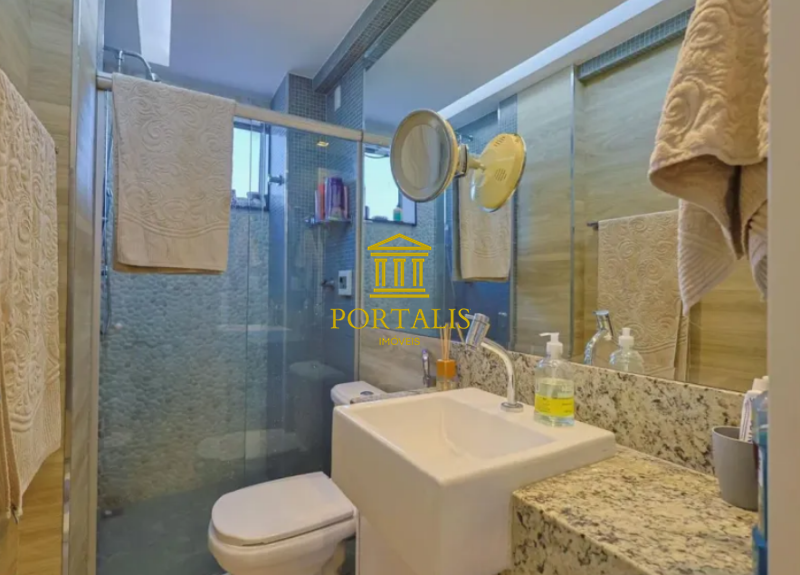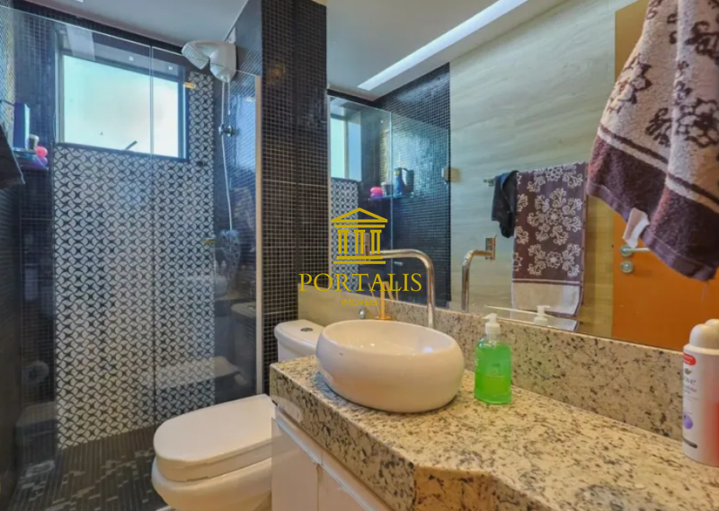 * Banheiro social (e suíte) com bancada em granito, armário e box em blindex;