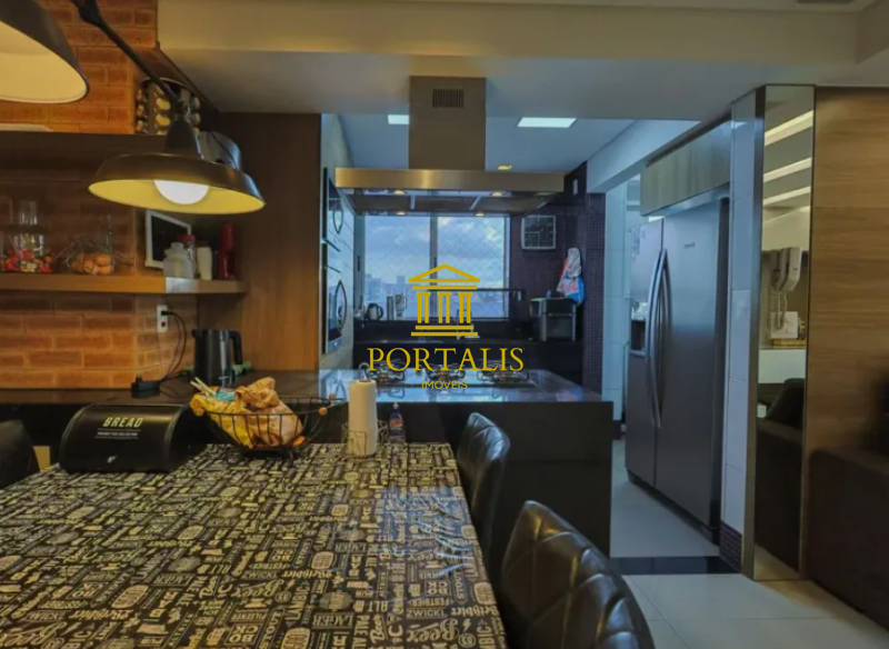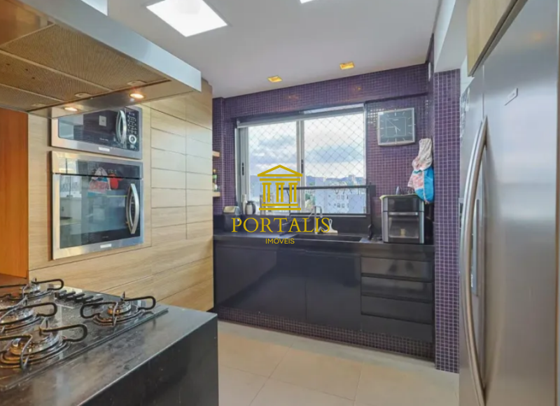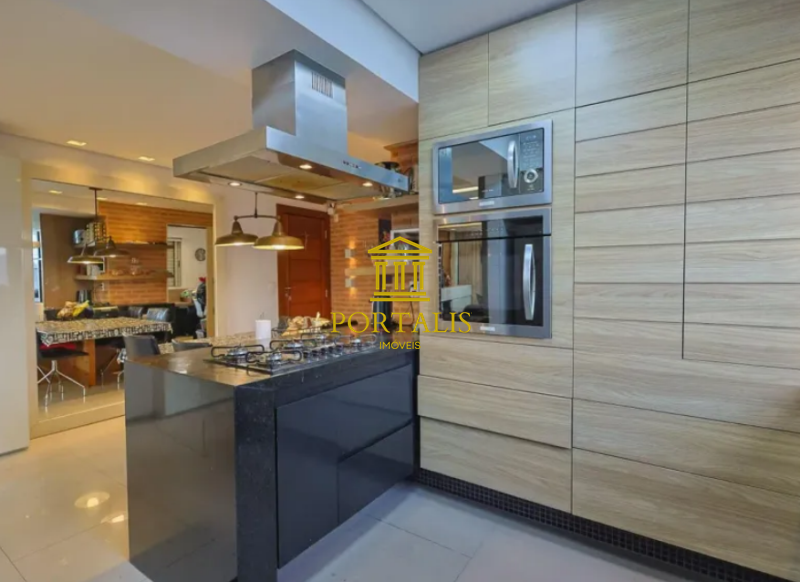 * Cozinha em estilo americano, com armários e bancadas em granito;